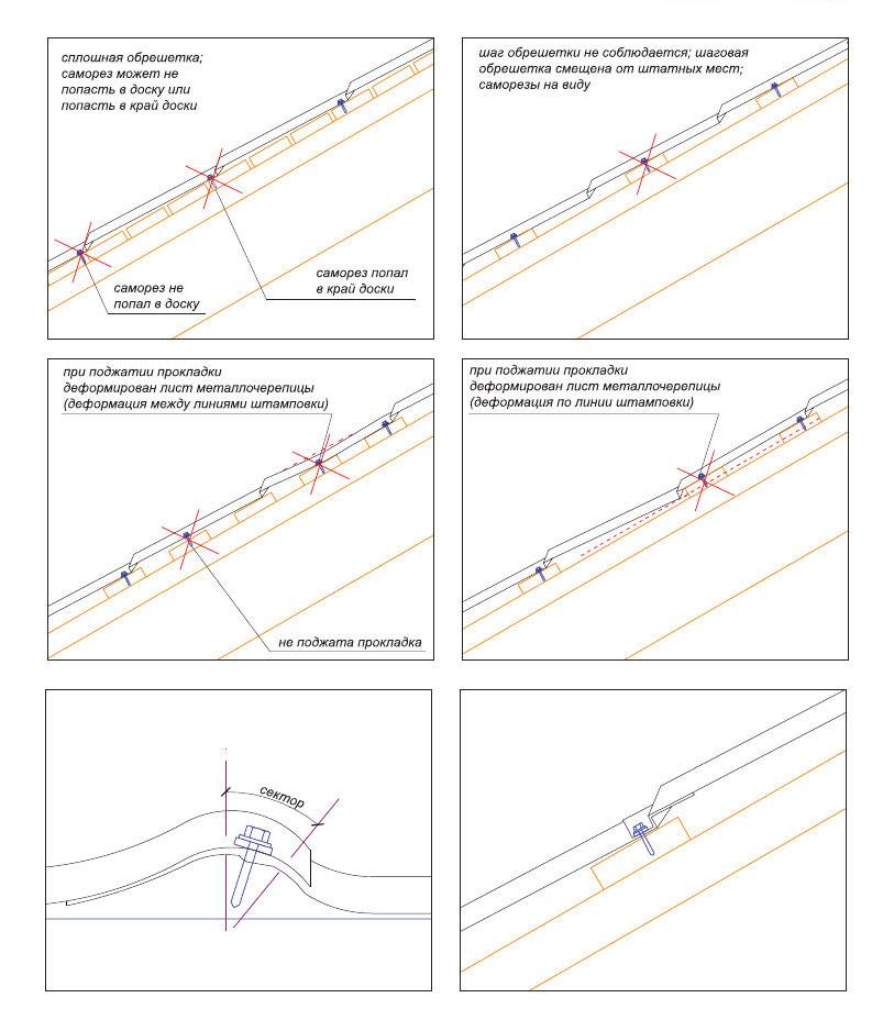 Крепление металлочерепицы следует производить самонарезающими винтами с уплотняющей прокладкой. При креплении листов между собой применяют саморезы 4,8×19, а крепление листов к обрешетке производят саморезами 4,8×25 мм. Предварительно, общий расход саморезов можно принять из расчёта 7–10 штук на квадратный метр. Крепление листов между собой нужно производить под углом, близким к 90°, при этом не следует направлять саморез именно в капиллярную канавку. К обрешетке листы крепятся на расстоянии 15 мм под волной, через две волны. В карнизной, коньковой и фронтонной части – через одну волну. Перед завинчиванием самореза убедитесь, что он попадёт в центр обрешетки, а не вызовет скалывание древесины по краю доски обрешетки.