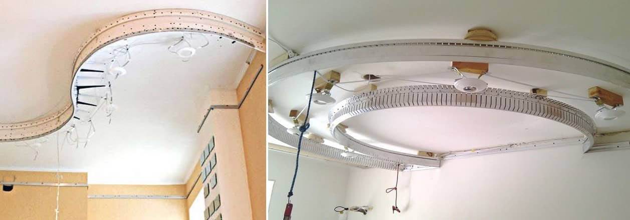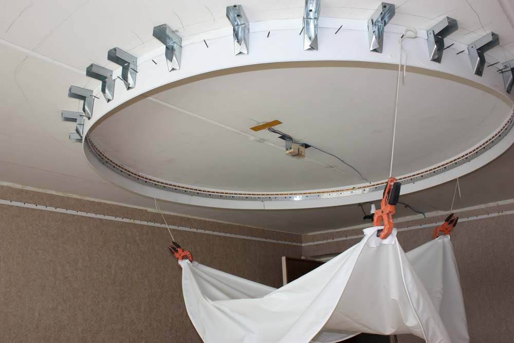 При устройстве сложных форм натяжного потолка (например, для двухуровневого потолка с кривыми линиями, сводами купола и пр.) необходимо запастись различными специальными крепежами, которые используются для создания нужных линий и форм.