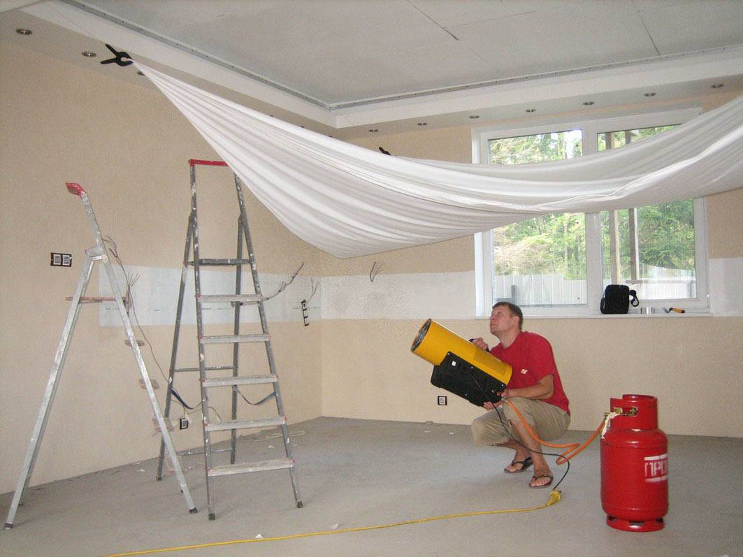 - Тепловая пушка (при использовании полотна из поливинилхлорида), которая позволит поднять температуру в помещении до 40 °С и нагреть полотно до 60 °С (для этих целей также можно использовать строительный фен);