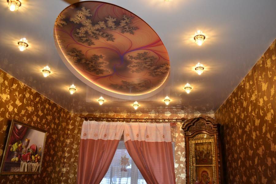 Конструкция натяжного потолка не позволяет крепить люстру непосредственно к мягкому полотну. Однако, специально проделанное в нем отверстие дает возможность украсить интерьер подходящей по стилю люстрой практически любого размера.