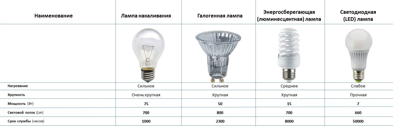 Сравнительная таблица для классических лампочек и LED моделей приведена ниже.