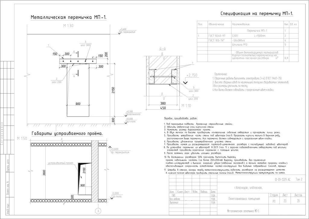 Проектная документация содержит подробное описание технологии проведения пробивки проема в несущих стенах: