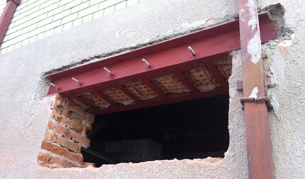 Важно, чтобы усиление кирпичных проемов производилось в виде П-образной рамы из уголка и швеллера и включало в себе перемычку (баку) и две стойки с опиранием на стальной лист, обеспечивающий равномерное распределение нагрузки
