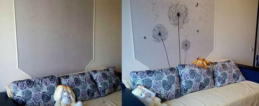 Желательно, чтобы настенный рисунок перекликался с какими-либо элементами интерьера, например, с подушками на диване, картиной на одной из стен, ковром, шторами или скатертью.