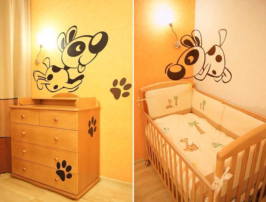 - Для самых маленьких. В первые дни жизни ребёнка мало что интересует, кроме лица мамы и тактильных ощущений. Когда малыш начнёт оглядываться по сторонам, он должен видеть вокруг себя дружелюбный мир в нежных тонах. На пастельных стенах можно наклеить некрупных бабочек, яблоки, мячики, цветы. Приветствуются простые линии и формы. Противопоказаны ядовитые и яркие краски, контрастные переходы.