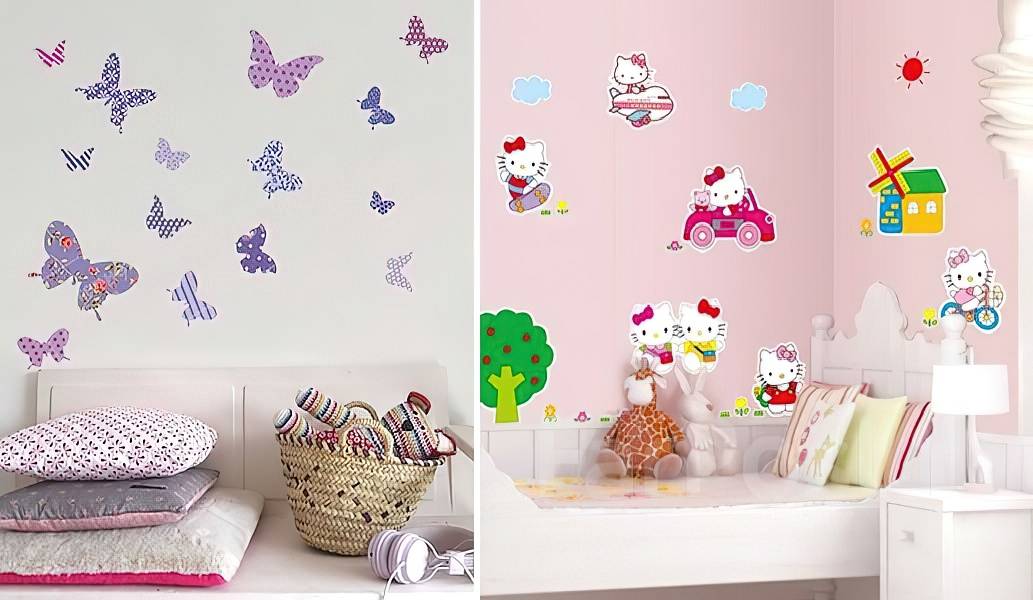 - Мини-наклейки. Такие картинки удобно клеить на детскую мебель. Оформление комнаты можно доверить ребёнку 3-4-х лет. Пусть проявляет творчество, принимая участие в украшении собственной территории.