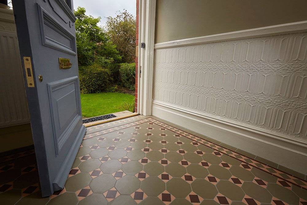 - Как отмечалось ранее, более прочный материал – плитка, укладывается у порога, повышая практичность напольного покрытия.