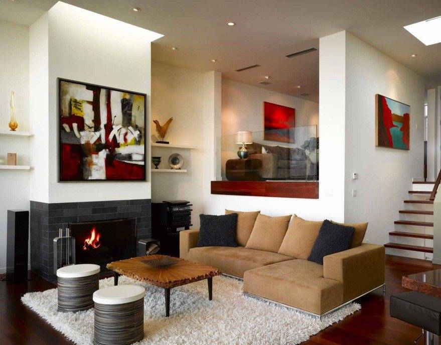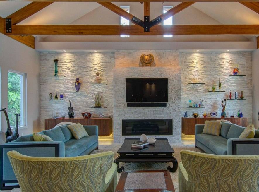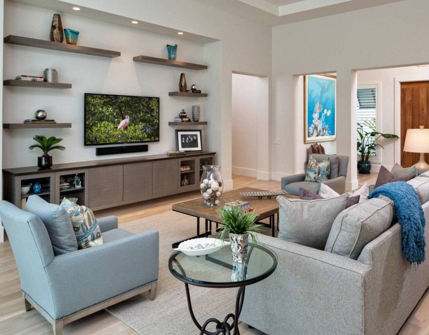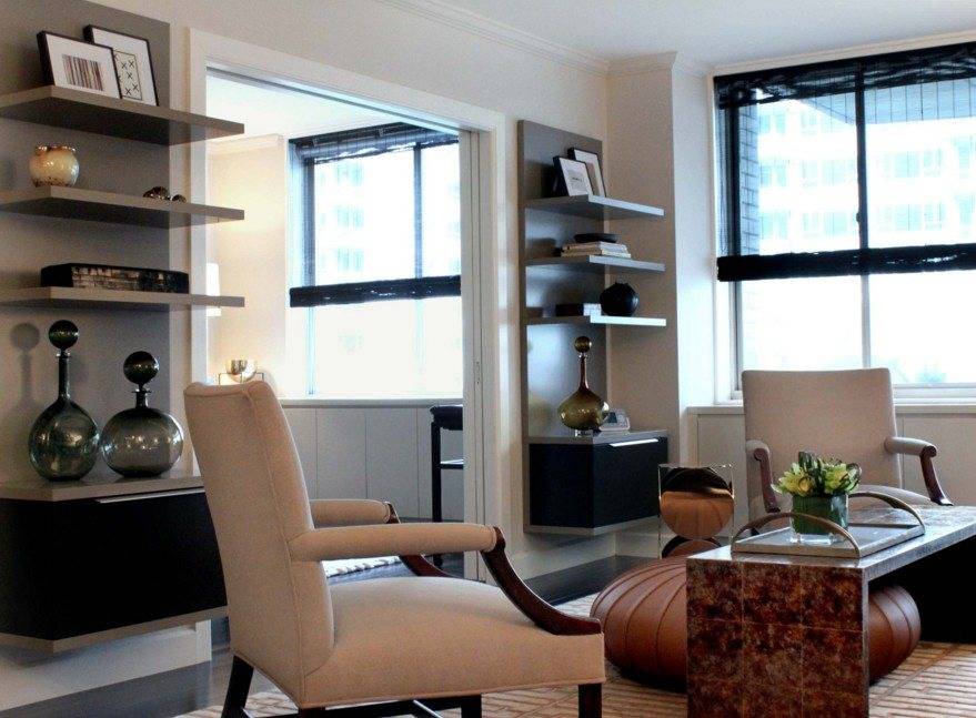В зале самым распространенным местом для расположения полочек, является поверхность стены за диваном или креслами. Пустующий участок можно дополнить компактными или узкими конструкциями и заполнить их изящными сувенирами, небольшими картинами или семейными фотографиями.