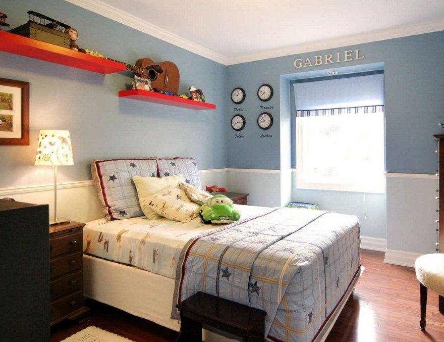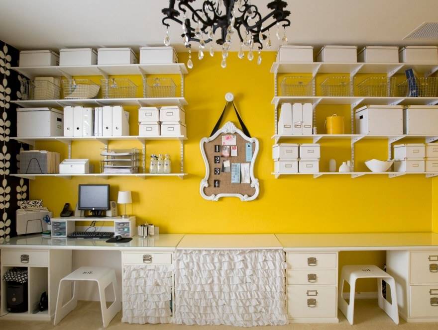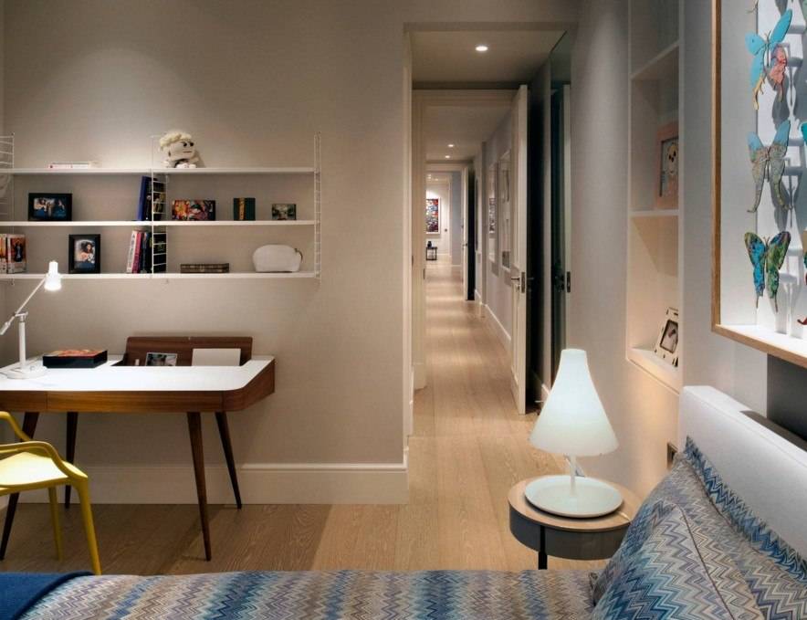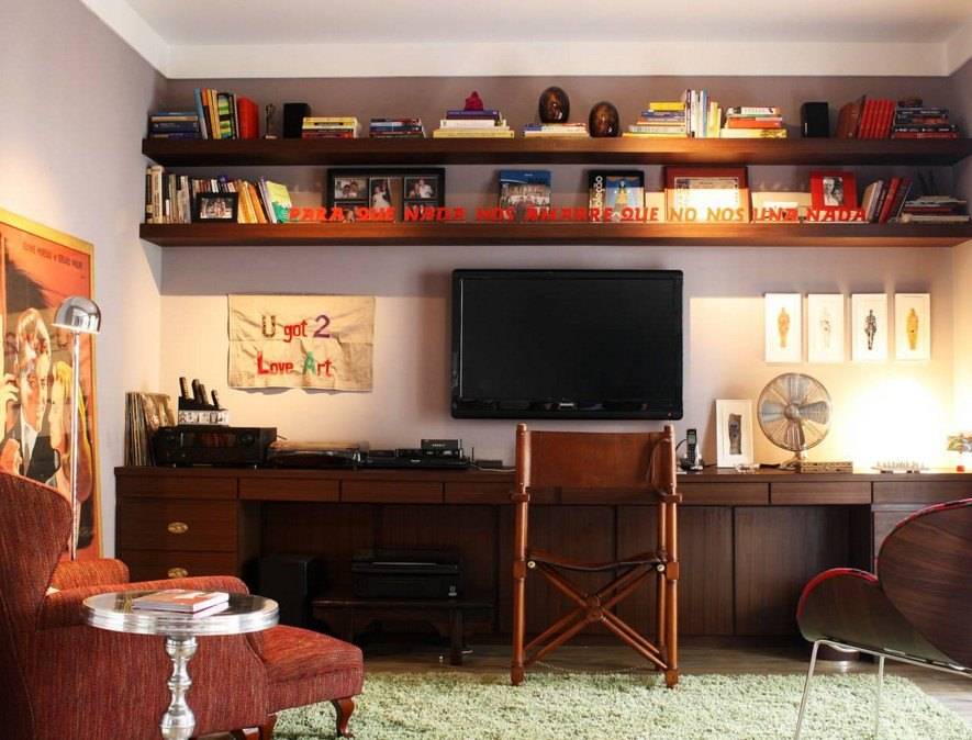 Отличным решением является расположить полочки во всю стену над письменным или компьютерным столом. Таким образом получится добиться систематизации вещей и их максимально удобного хранения под рукой. Кроме того, за счет такого эффектного дизайнерского приема, обстановка будет смотреться стильно и приобретет творческий настрой.