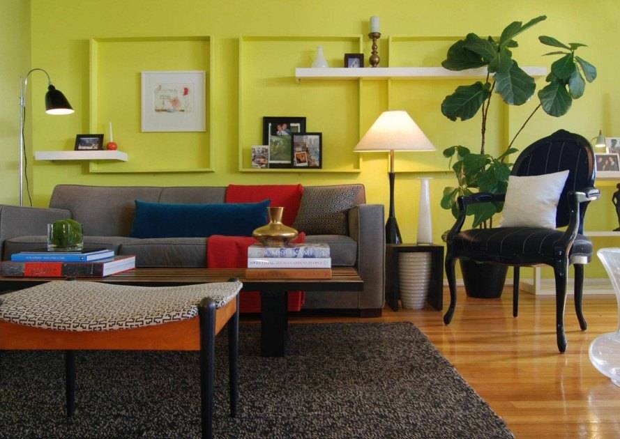 Оригинально будут смотреться изделия, размещенные в хаотичном, шахматном порядке или полки с контрастным исполнением по отношению к отделке стен.