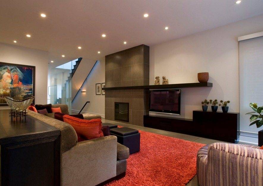 На фото дизайн гостиной с закрытой полкой над диваном.