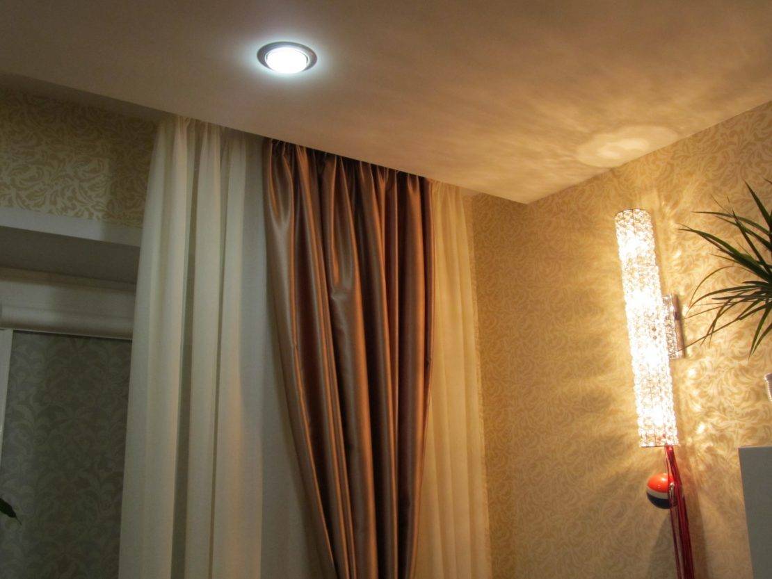 Для этого внутри прокладывается проводка, а во внешней плоскости, обращенной к полу, вырезаются отверстия под встроенные светильники. Еще один вариант обеспечить красивую иллюминацию гардинам или ламбрекену – проложить по внутренней стенке ниши светодиодную ленту. Этот вариант выгоден тем, что дает красивое освещение, и в то же время не нагревает ткань. Если у вас будут натяжные потолки, ниша под карниз делается с помощью обычного бруса большого сечения (он станет основанием для багета), глубину можно регулировать с помощью кронштейнов.