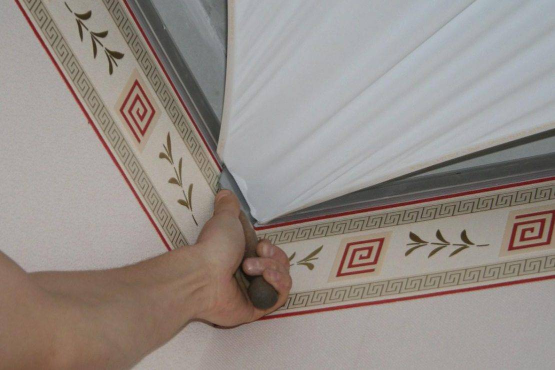 - При помощи тепловой пушки воздух разогревают до 60-70°С. Когда полотно приобретет необходимую эластичность, его заправляют в багет с помощью шпателя с закругленными концами. Работу начинают вести от углов помещения, постепенно продвигаясь к центральной части.