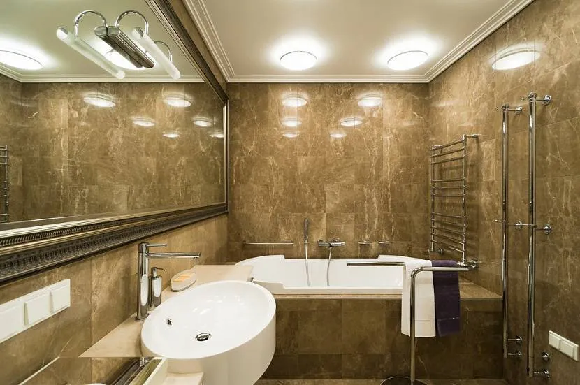 - Не желательно применять слишком яркие потолочные изделия в небольшом санузле, потому что такие модели зрительно сделают помещение тесным и некомфортным.