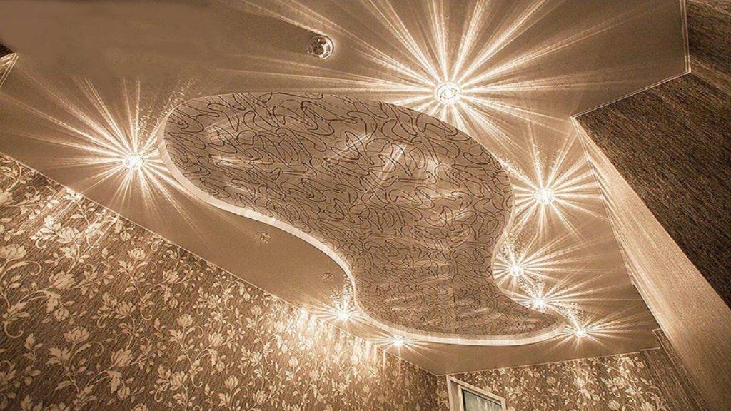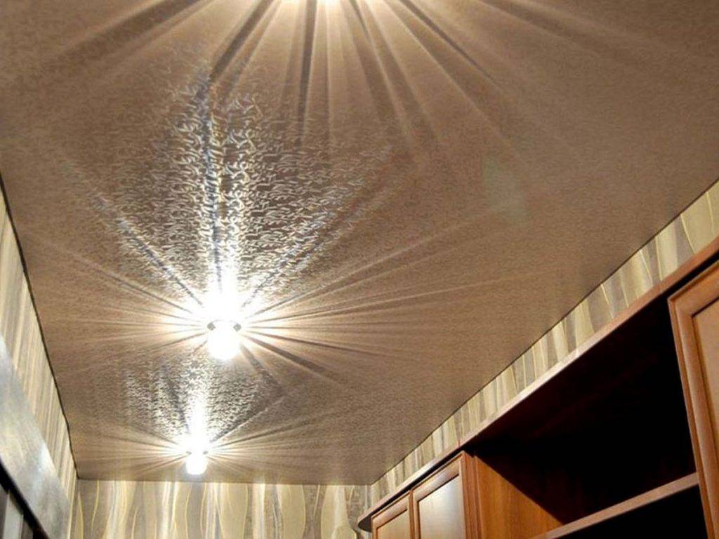 Для лучшего эффекта в такой потолок стоит вмонтировать несколько точечных светильников.
