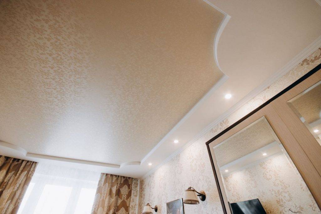 Плёнка скроет неровности перекрытия, вентиляцию, проводку, датчики охранной или пожарной сигнализации. При больших перепадах высот делают многоуровневые потолки.