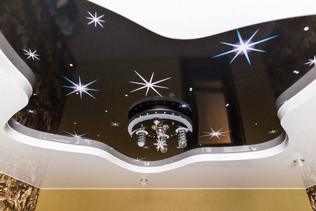 Если хочется разнообразить дизайн, можно выбрать натяжной потолок с ненавязчивыми цветами, завитками или эффектом звездного неба. Последний вариант будет необыкновенно романтично выглядеть в темноте, подсвеченный миниатюрными диодами.