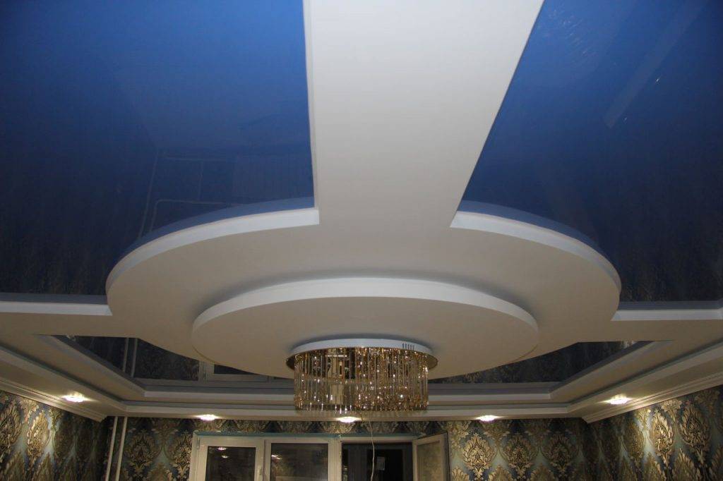 Если требуется разделить пространство на зоны, монтируют двухуровневые потолки. Полотна устанавливают одинакового цвета и фактуры либо комбинируют. В качестве дополнительного освещения добавляют точечную или скрытую подсветку.