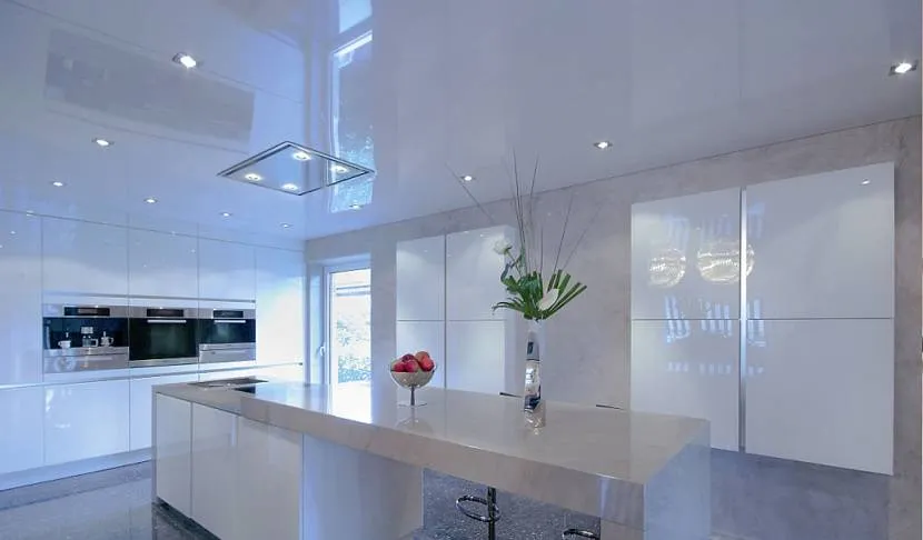 Наиболее распространенным решением в ремонте является применение натяжного потолка с глянцем из пленки ПВХ. Также есть специальные краски с фактурой, отражающей свет.