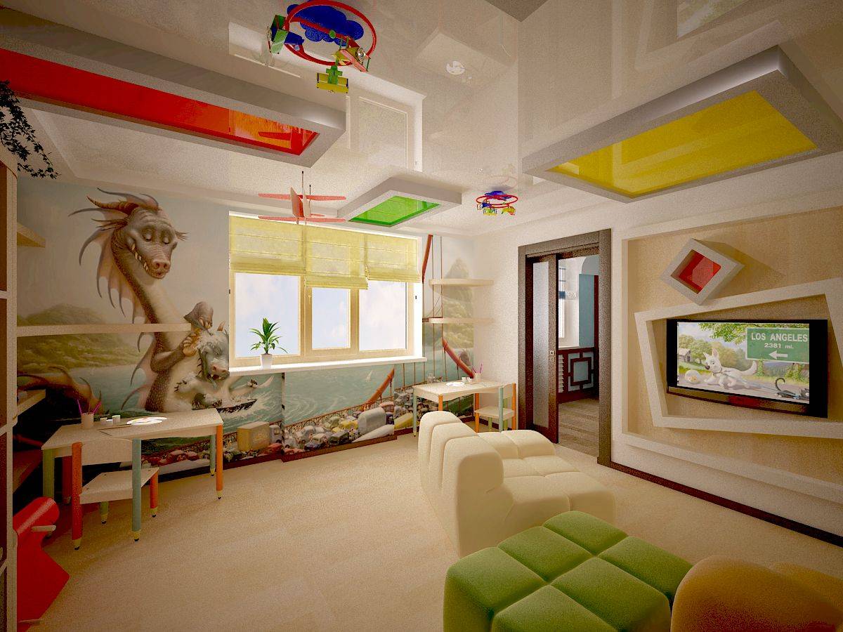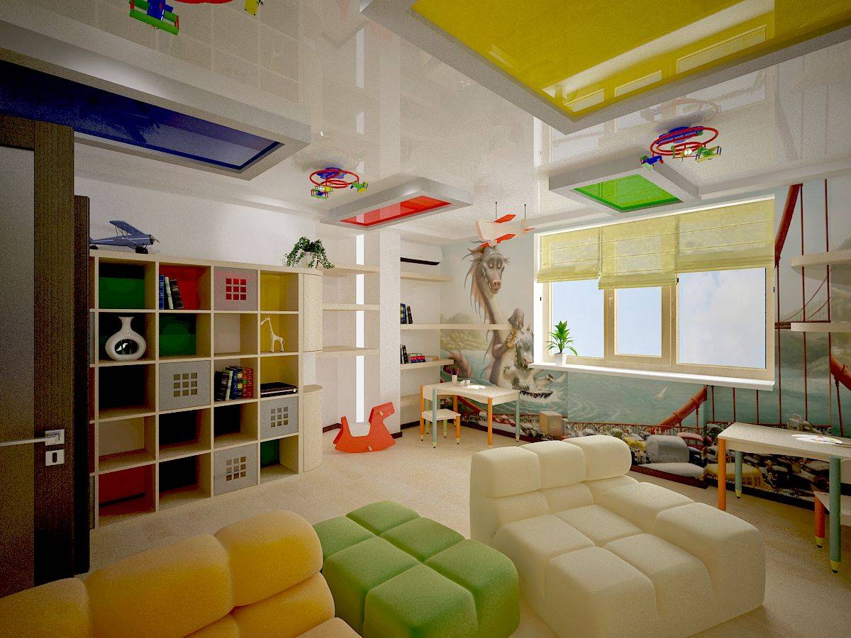 - В-третьих, если в семье девочка и мальчик, а жилищные условия не позволяют выделить им разные комнаты, с помощью натяжного потолка легко зонировать пространство в помещении, создав для каждого ребенка подходящую обстановку.