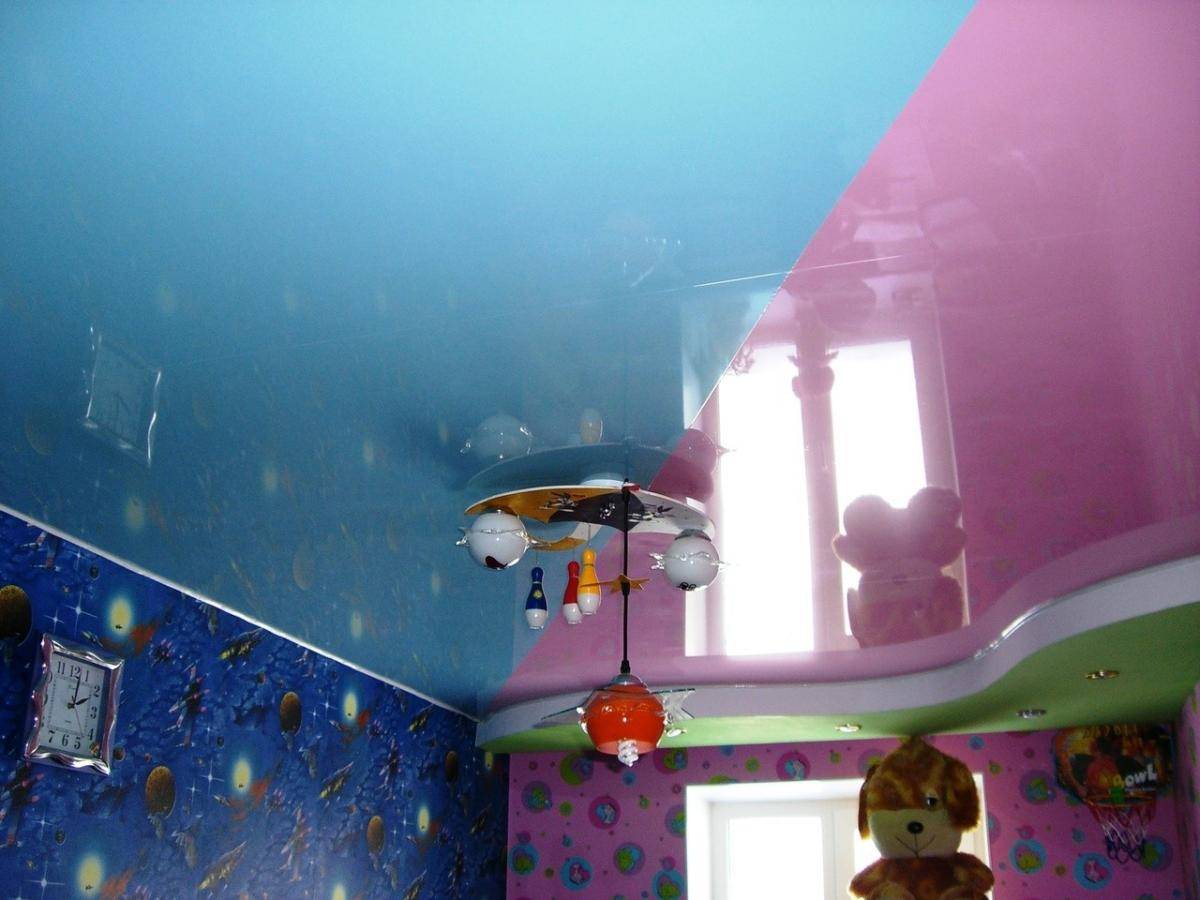 Яркий двухцветный глянцевый потолок — красивое довершение интерьера детской