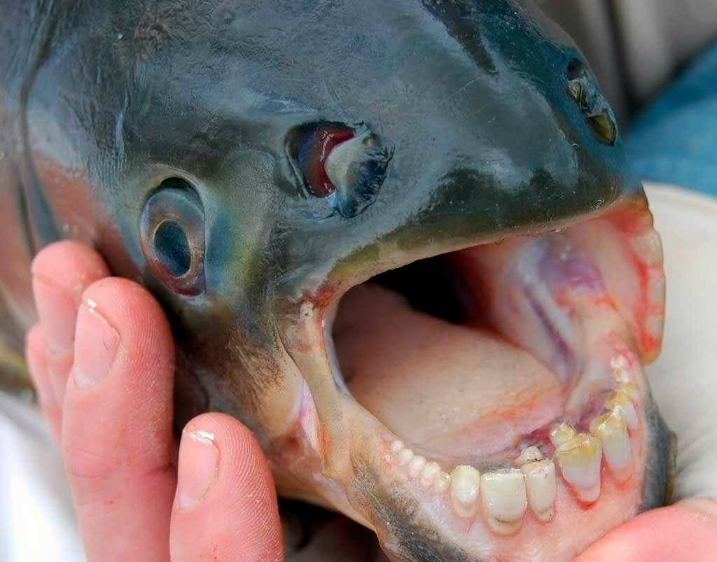 И она вовсе не безобидна. Паку — экзотическая рыба, которая состоит в близком родстве с пираньями. Живёт эта рыба только в водах Амазонки. В отличие от пираний паку питаются орехами и фруктами, которые падают в воду, водорослями, иногда они поглощают мелких рыб и беспозвоночных. По этой причине их зубы не острые, как у пираний, а плоские, как у человека. Однако, несмотря на свою неагрессивность, паку может нанести человеку увечья за счёт мощных челюстей. В Папуа — Новой Гвинее эти рыбки кастрировали нескольких стоящих в воде рыбаков, по ошибке приняв их гениталии за орехи. Паку может вырастать до метра в длину и выглядит довольно необычно.
