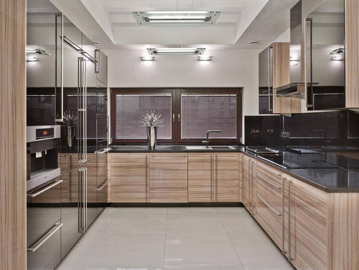 При оформлении п-образных кухонь без окон важно предусмотреть хорошее освещение. Встраиваемые светильники станут отличным решением.