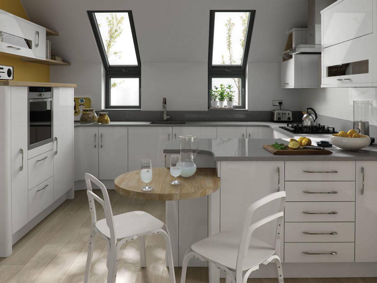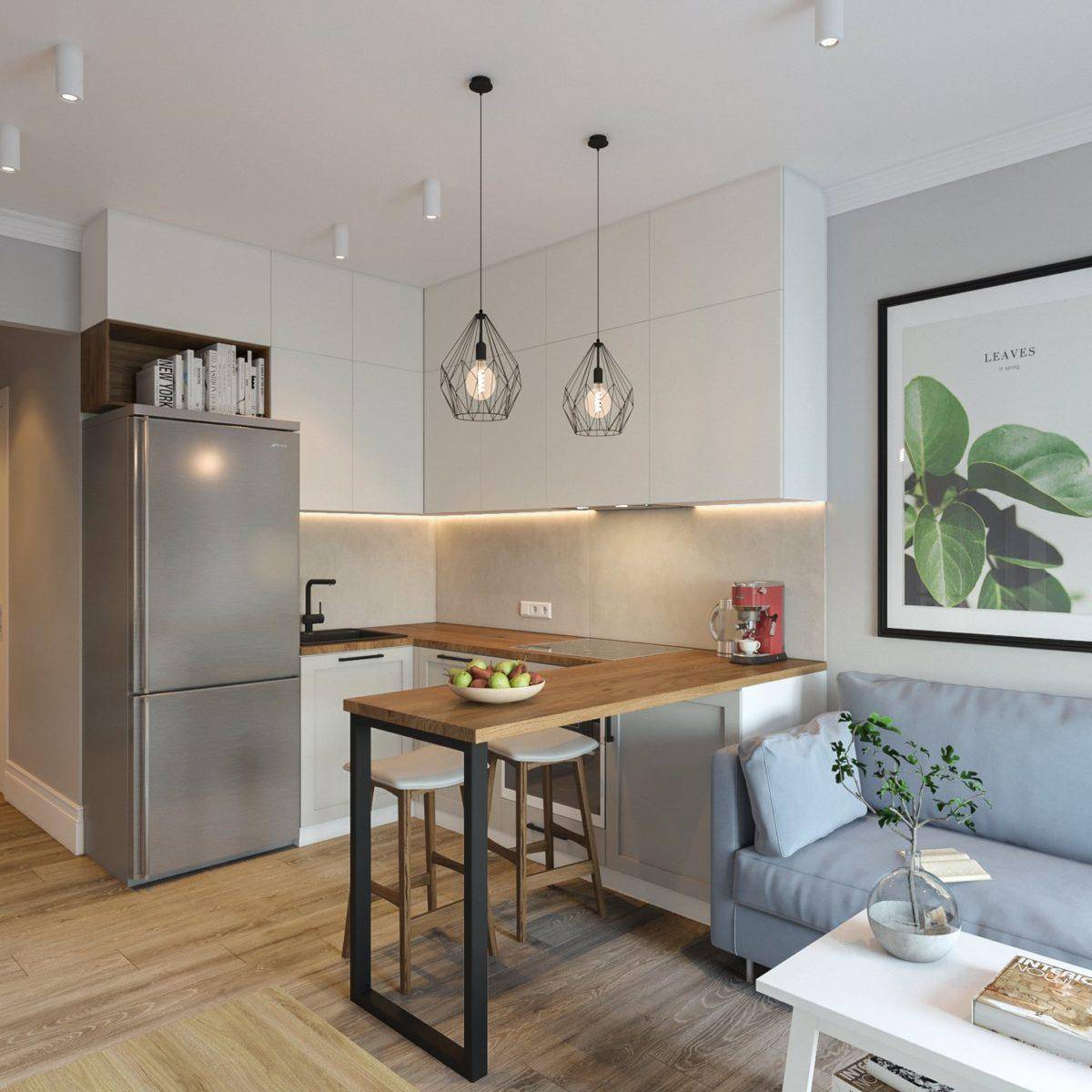 Если же помещение небольшое, стоит отдать предпочтение Г-образной, либо линейной планировке. Обеденный стол можно установить в центре, либо прислонить его к одной из стен. Вместо него также можно использовать широкий подоконник с откидной столешницей, либо барную стойку.