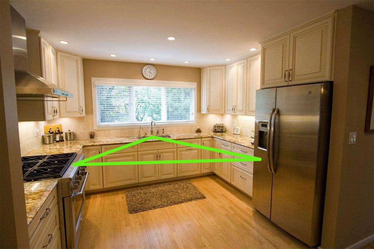 Очень важно соблюдать так называемое «правило треугольника» — основная рабочая зона, которая состоит из плиты, холодильника и мойки, должна располагаться максимально компактно, тогда хозяйке будет удобно ею пользоваться, не придется бегать по всему помещению, делая массу лишних движений. Указанные предметы следует установить так, чтобы образовался треугольник, длина каждой из сторон которого не может превышать 2 метра. Указанные предметы следует установить так, чтобы образовался треугольник, длина каждой из сторон которого не может превышать 2 метра