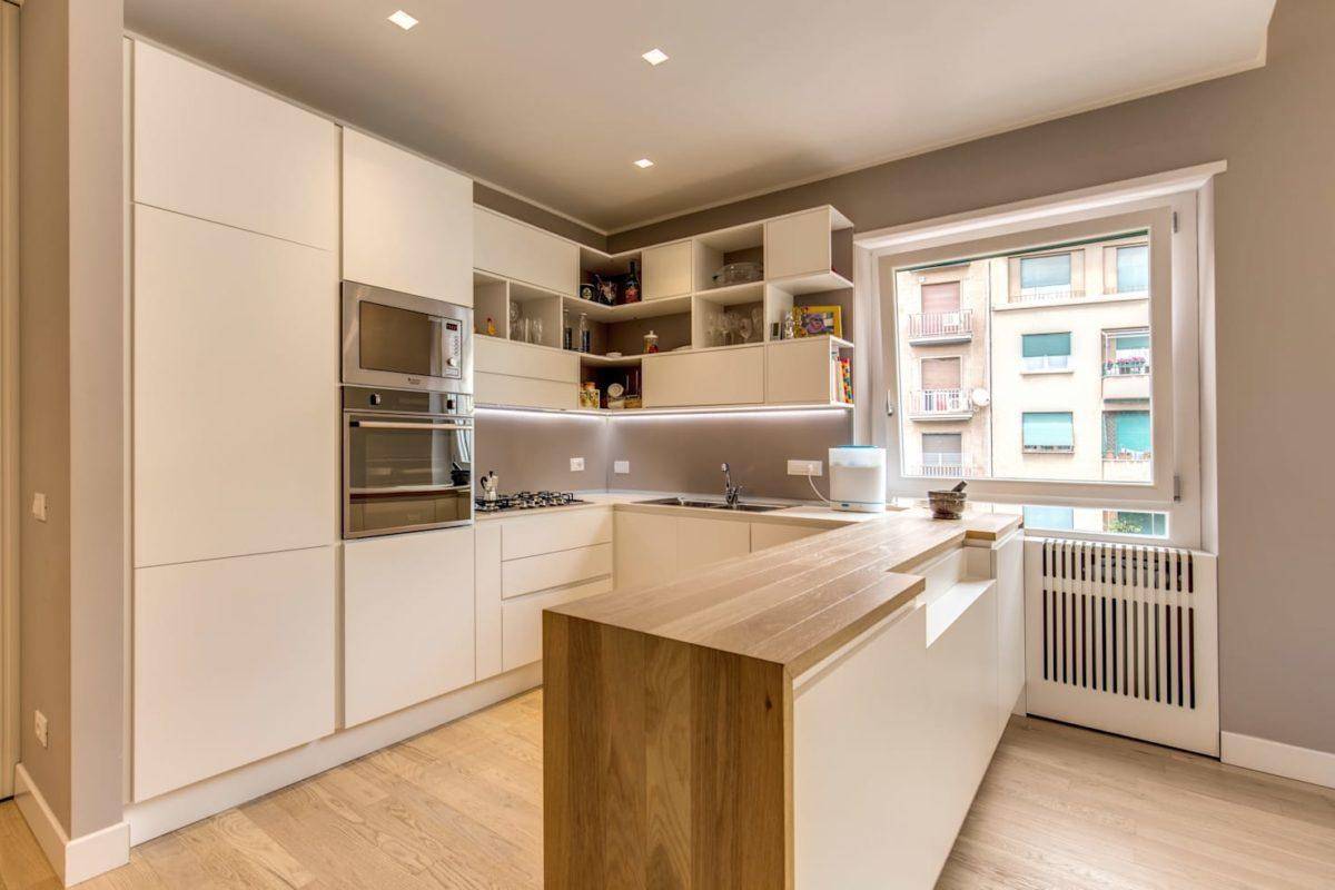 И кухня с окном посередине, и узкое вытянутое помещение со «светом в конце туннеля», может легко увеличивать количество рабочих мест за счет нетрадиционного расположения предметов кухонной меблировки.