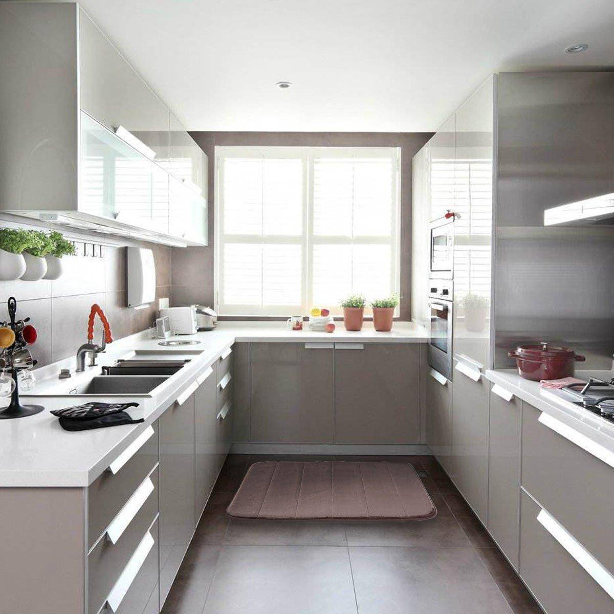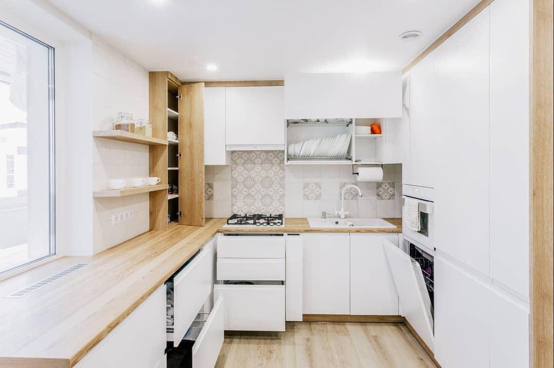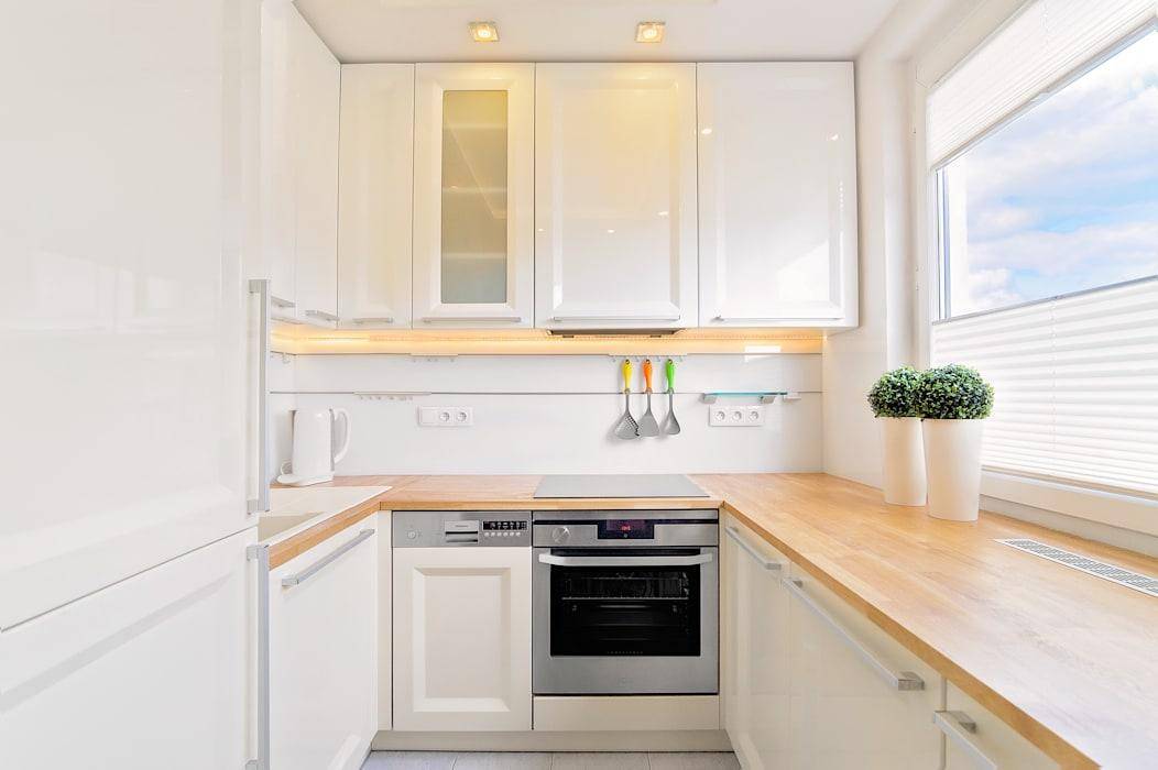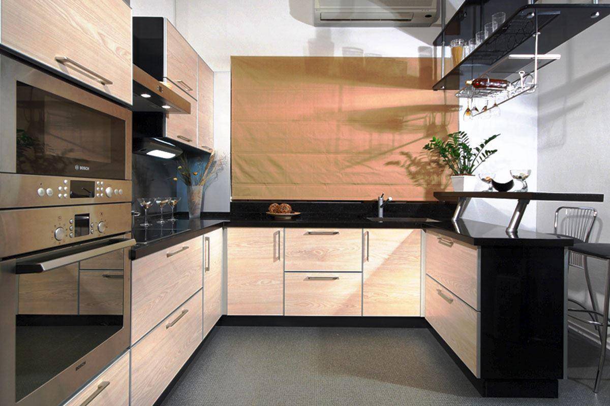 П-образный гарнитур в маленькой квартире подойдёт для людей, которые хотят использовать площадь на максимум. Эта планировка позволяет организовать вместительное хранилище, просторную рабочую зону и поставить всю необходимую технику. Стол в виде части гарнитура (на подоконнике/в качестве барной стойки) сэкономит место, если вынести его в другую комнату невозможно.
