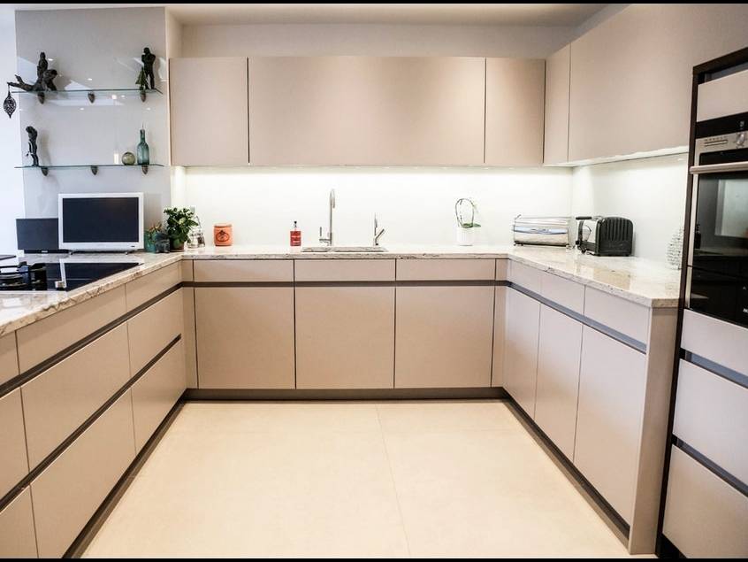 П-образная кухня — эталон распределения места в соответствии с правилом рабочего треугольника, которое гласит, что основные элементы кухонных приспособлений должны размещаться подобно равнобедренному треугольнику (в вершинах находятся мойка, плита и холодильник). Это идеальное планирование для просторных кухонных помещений. Существует возможность асимметрического размещения, что придает индивидуальность стилю и дизайну мебели.