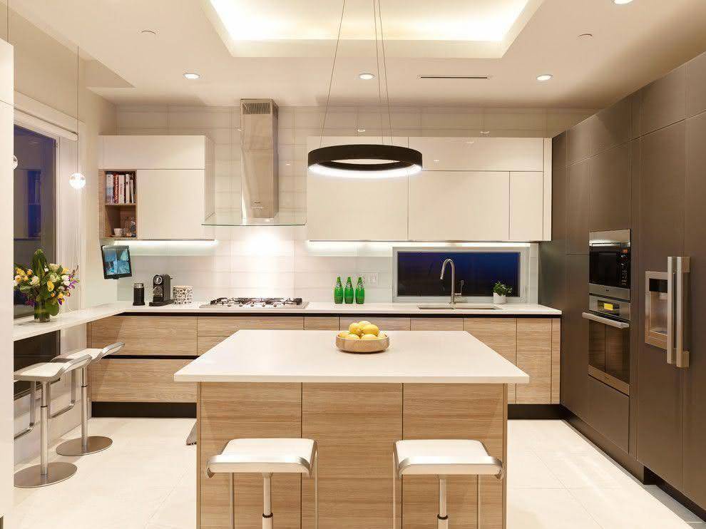 Не стоит забывать про дополнительное освещение острова. В зависимости от стилистики дизайна подбираются потолочные светильники.