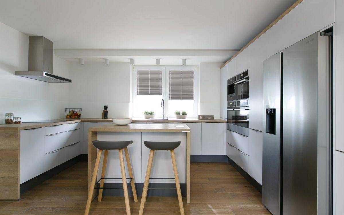 Лучше всего завершает композицию П-образной кухни барная стойка. Рекомендованная высота — 95–110 см. Ширина столешницы зависит от потребностей хозяев. Будет она использоваться в качестве обеденного стола или только для приготовления напитков — решать владельцам жилья.