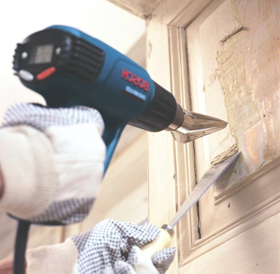 Строительный фен необходим для нагревания покрытия до высокой температуры, вследствие чего лакокрасочный материал отслаивается от поверхности. Как только он начал отслаиваться, его сразу же нужно удалить скребком или обычным шпателем, пока покрытие не успело остыть. Работая этим инструментом, необходимо точно узнать, где находится электрическая проводка, чтобы не нагреть ее и не повредить изоляцию. Строительный фен больше подходит для обработки небольших участков, а для обширных площадей лучше воспользоваться болгаркой, электродрелью или перфоратором.