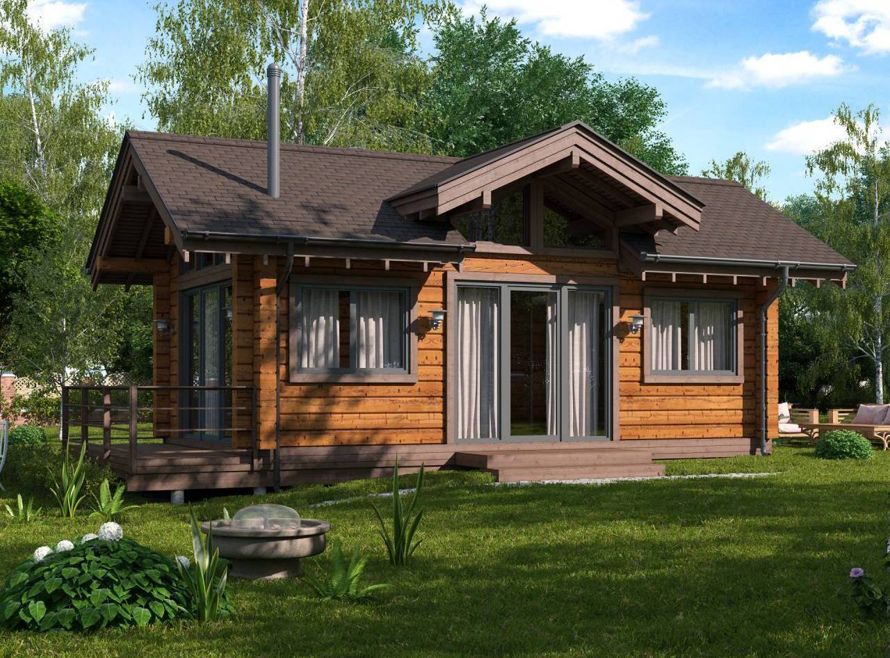 В таком доме всё компактно — небольшая кухонная зона, которая может быть соединённой с гостиной, что позволяет сэкономить пространство, а может быть отдельным функциональным помещением; небольшая гостиная, имеющая площадь до 10 квадратов. Спальных комнат предусмотрено одна или две — это зависит от площади дома.