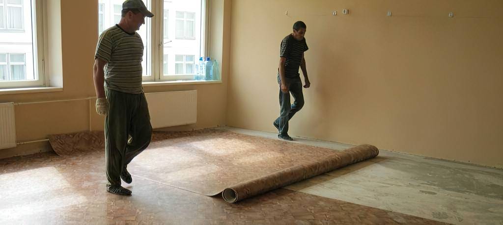 - проведения подготовительных работ, что включает демонтаж старого линолеума, выравнивание поверхности и даже вынос мебели;