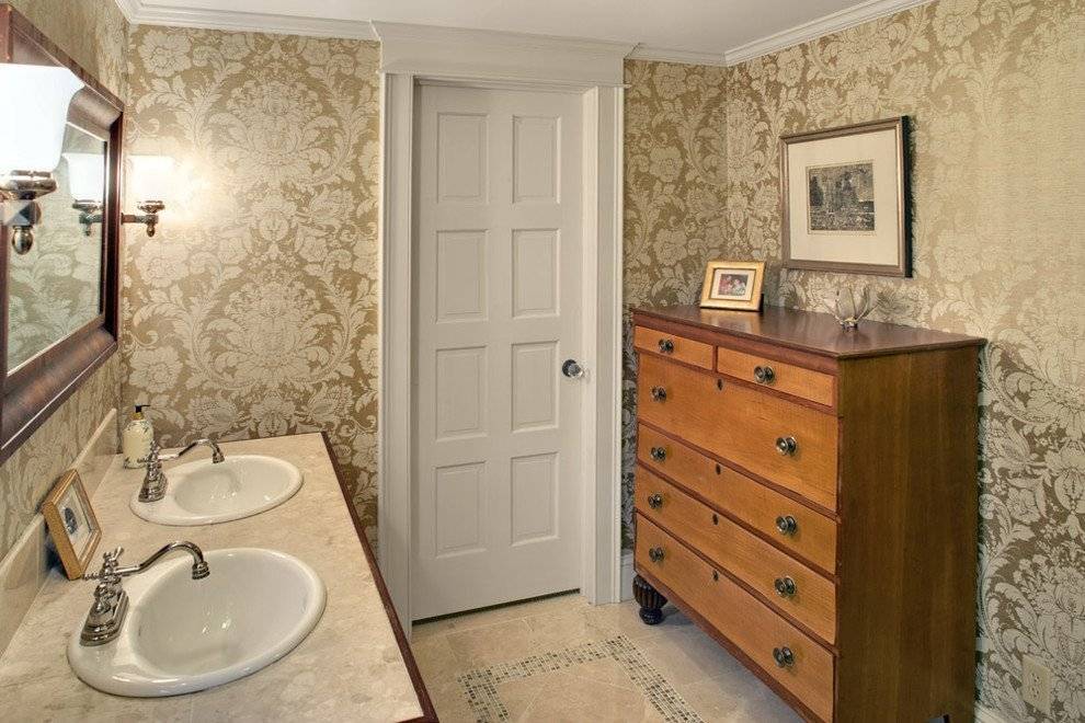 Даже ванная комната только выиграет, если на плитке там будет красоваться узор дамаск. Восточный орнамент редко применяют на всех стенах в помещении. Более удачный вариант – это украшение одной стены в сочетании с однотонными обоями спокойных оттенков. Традиционный дамаск бывает не только черно-белым, но и красно-золотым. Встречаются варианты с добавлением серебряного и зеленого цвета.