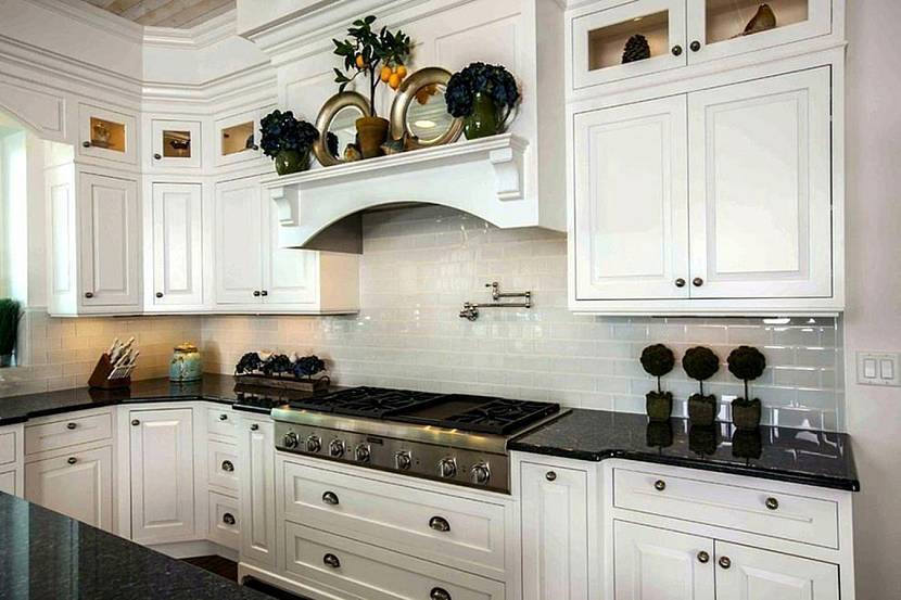 Отличное сочетание белой мебели и темной столешницы из камня сделает акцент на середине кухни, при акцентировании стен можно сделать фартук над рабочей зоной из черной плитки или мозаики. В дополнение черному фартуку и столешнице стильно будут смотреться стол и стулья темного цвета.