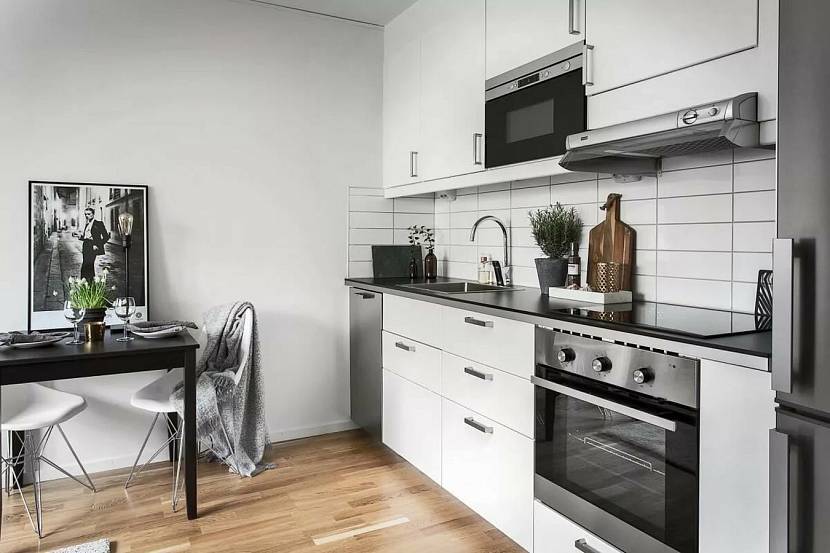 Отделка кухни с чёрно-белым гарнитуром