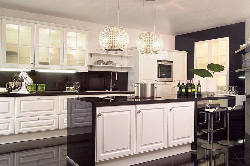 На потолке, который допустимо сделать глянцево-черным, присутствует несколько точечных светильников, над столешницами, одна из которых – островная, размещают лампу на длинном шнурке.