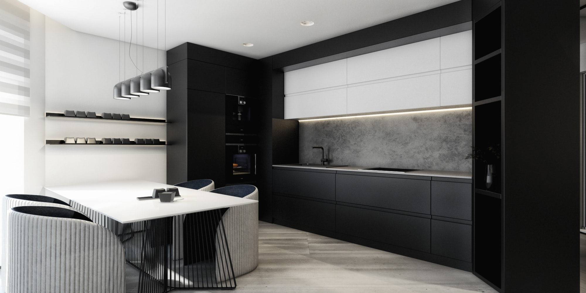 Минимализм в черно-белом интерьере кухни.