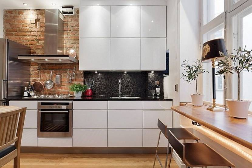 Чтобы разбавить монохром, дизайнеры рекомендуют фартук облицевать красным кирпичом, защитить термостеклом. В качестве напольного покрытия роскошно смотрится серый или бежевый ламинат под натуральную доску. Если нужно обыграть бело-черную композицию, тогда используют плитку-шахматку.