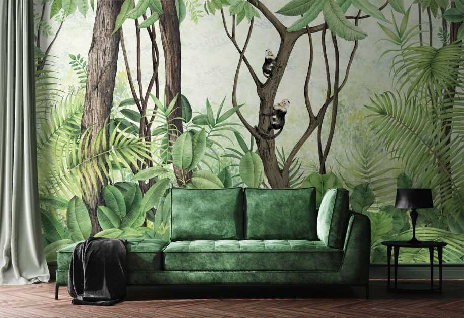 Стилю присуще использование в дизайне древесины, мехов, кожи, камня, в общем, производных натуральных материалов. В соответствии с этим выбираются и фоновые цветовые решения для зала. Это царство природных оттенков и растительно-анималистических принтов. Теплые, в пастельной гамме обойные цвета, отлично передают тематику изображений, буквально позволяя почувствовать дуновение ветра, шум волн, движение ветвей растений, хлопанье лебединых крыльев. Отлично будет восприниматься мозаичный рисунок с разнообразием его цветовых стилей в зале. Такие обои придадут интерьеру особую выразительность и изящность.