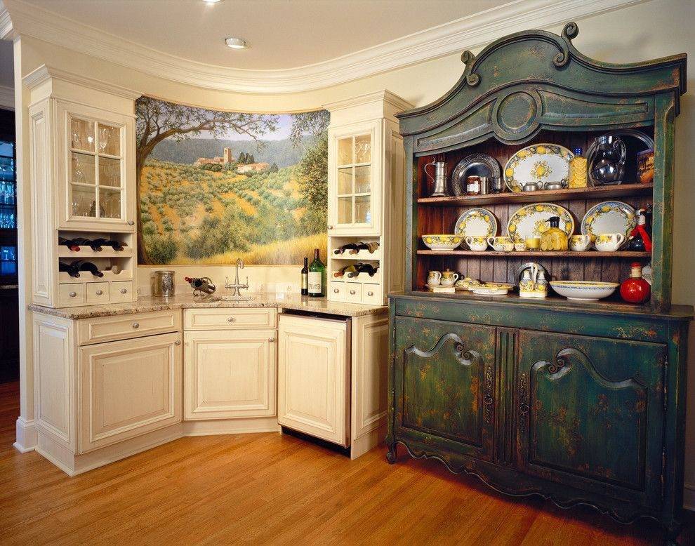 Часто для обстановки кухни используют старинные бабушкины столы и стулья: их чинят, обрабатывают и дарят им новую жизнь. На фото кухонь под старину часто можно увидеть присутствие массивного буфета, который также считается подходящим элементом для данного стиля. Конечно, в условиях небольшого помещения установить массивный шкаф с открытыми полками невозможно