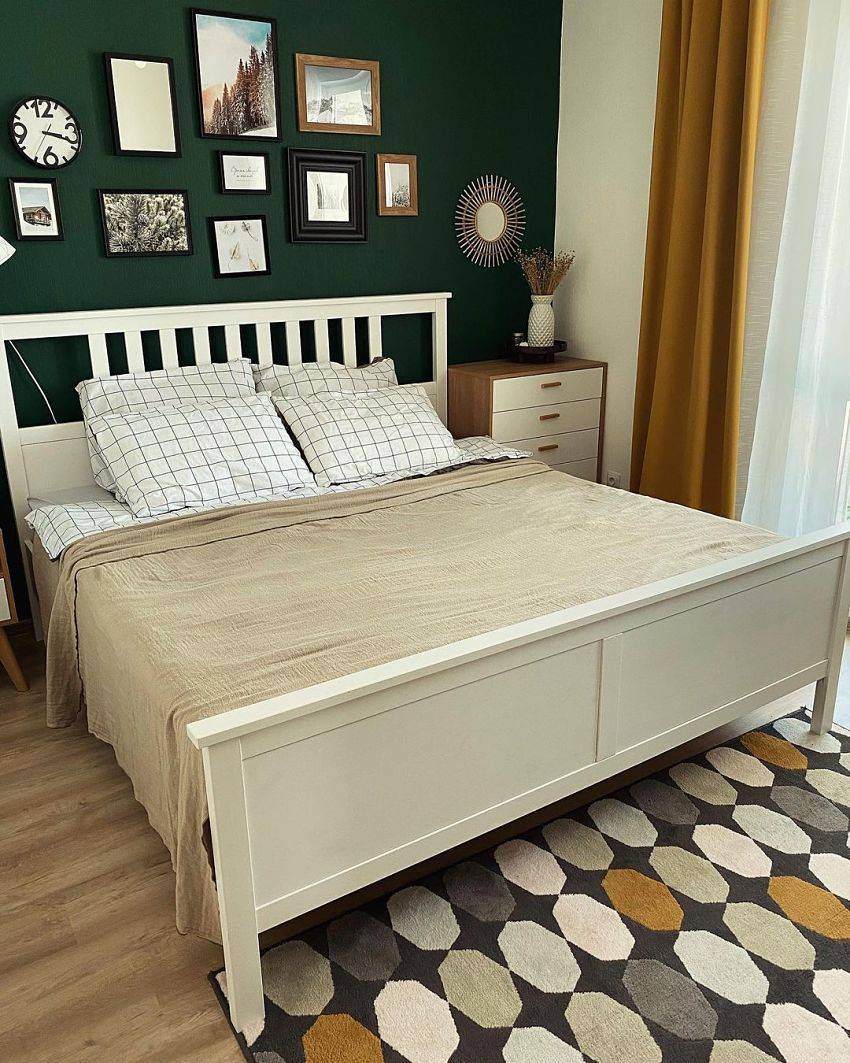 Важно, чтобы текстиль, используемый на окнах и на кровати, был разным. Это связано с тем, что наличие зеленой облицовки уже создает мощный визуальный посыл, который важно разбавить более нейтральными оттенками.