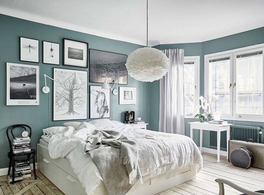 Для спален с мятным или другим светлым фоном идеально подойдут прозрачные белые занавески и портьеры, которые будут на несколько тонов темнее.