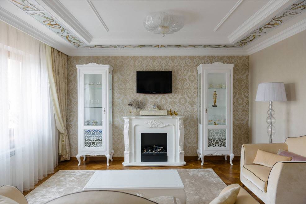 - Помимо обоев для гостиной в классическом стиле, ее стены могут быть оформлены: