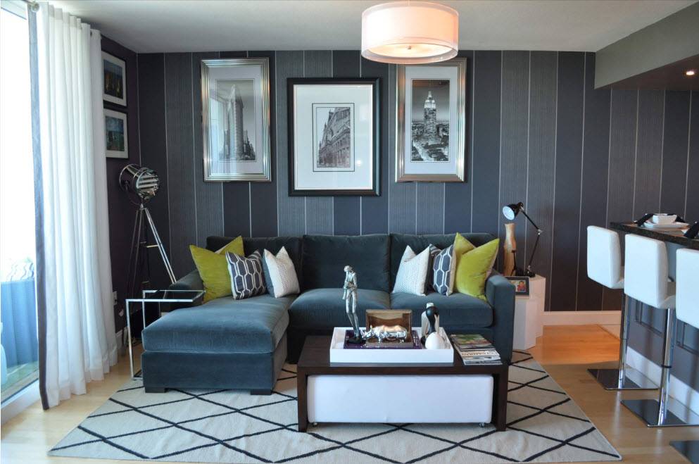 Визуально заполнить пространство комнаты с минимальной обстановкой, выделить контрастом обивку мебели позволит акцентирование одной стены