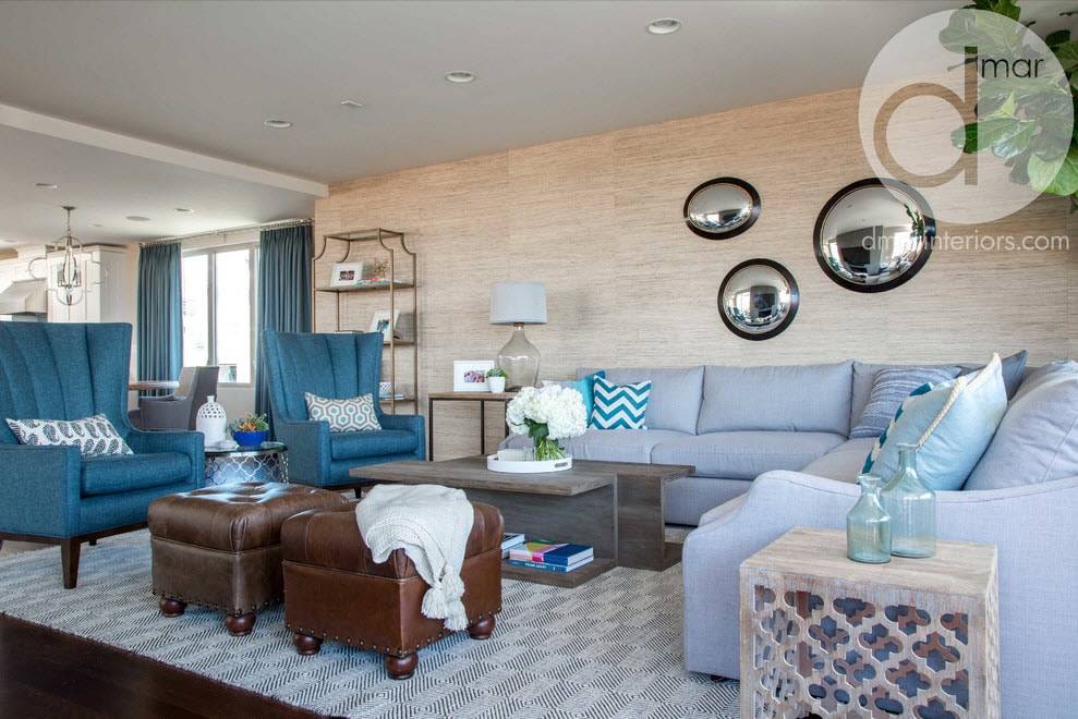 Создать спокойную умиротворенную атмосферу можно с помощью соответствующего цветового решения. Хороший пример мы видим на фото. Обои благородного синего оттенка не выглядят уныло и безлико. Дополняющие белые элементы придают живости интерьеру, делают гостиную изысканной и лаконичной. Здесь очень приятно проводить время в семейном кругу или с близкими друзьями, наслаждаться душевными беседами или просто отдыхать, с головой погрузившись в историю любимой книги.